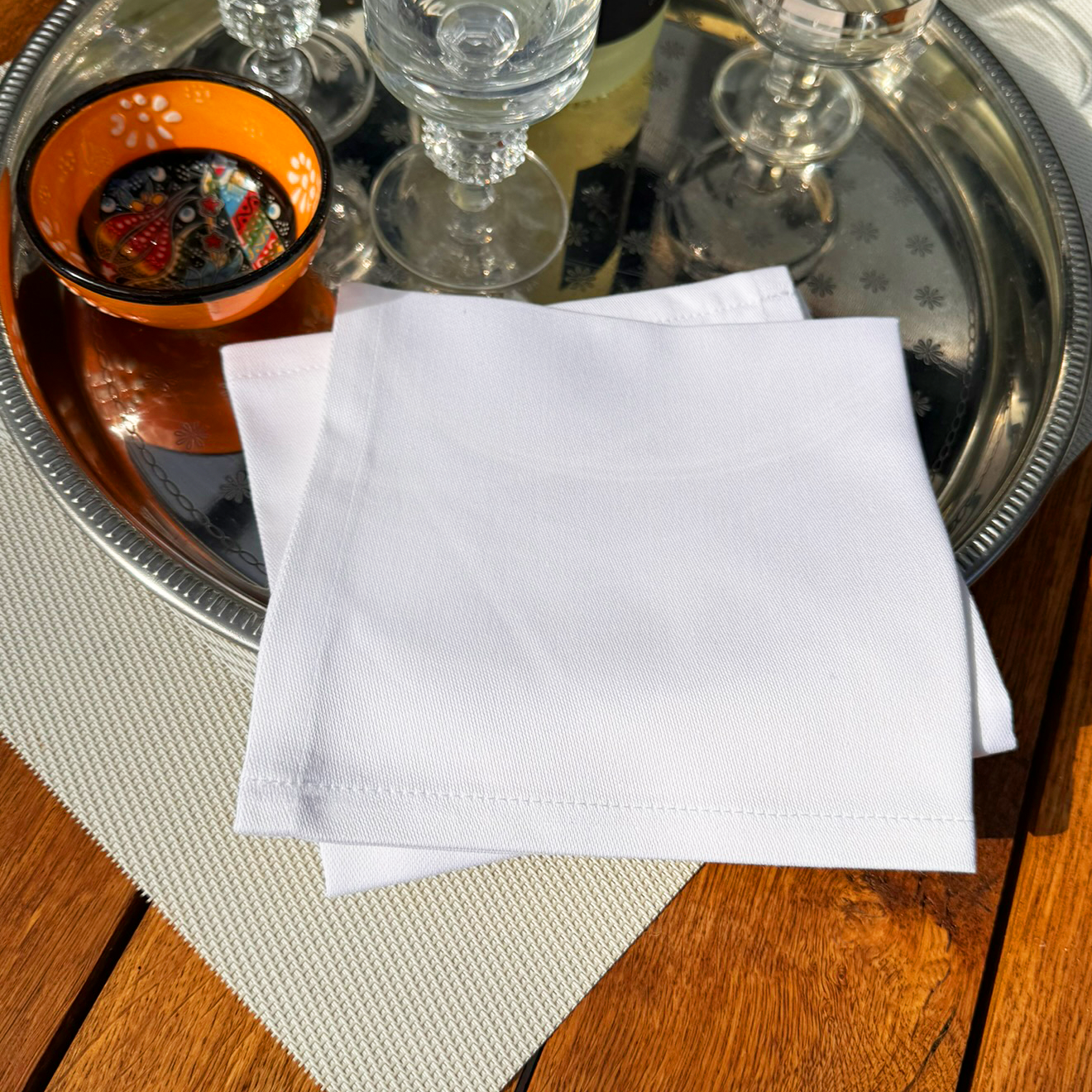 Wir bieten Ihnen hier einhundert ganz exklusive weiße Cocktailservietten aus Stoff. Die eleganten Servietten ohne Muster sind 30x30 cm groß und besitzen ein gefaltetes Maß von 15x15 cm, sie sind also sehr klein – optimal für Fingerfood, kleine Snacks oder schmackhafte Appetizer, die man auf die Hand nehmen und dann essen kann.